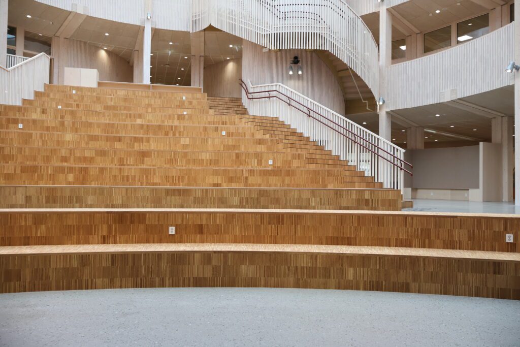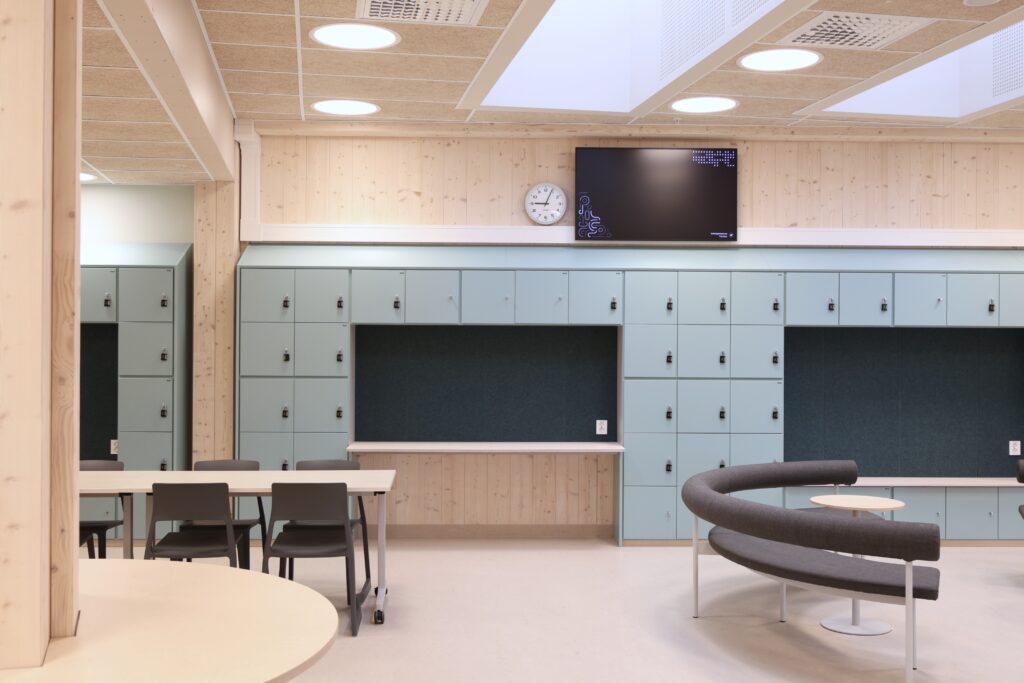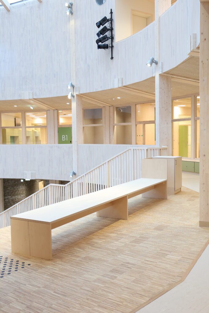 Nye Frakkagjerd ungdomsskole er et bygg med et tydelig og gjennomført arkitektonisk uttrykk. Vi har levert komplett fast inventar til hele skolebygget, tilpasset byggets form, funksjon og høye krav til bruk i en aktiv skolehverdag.
