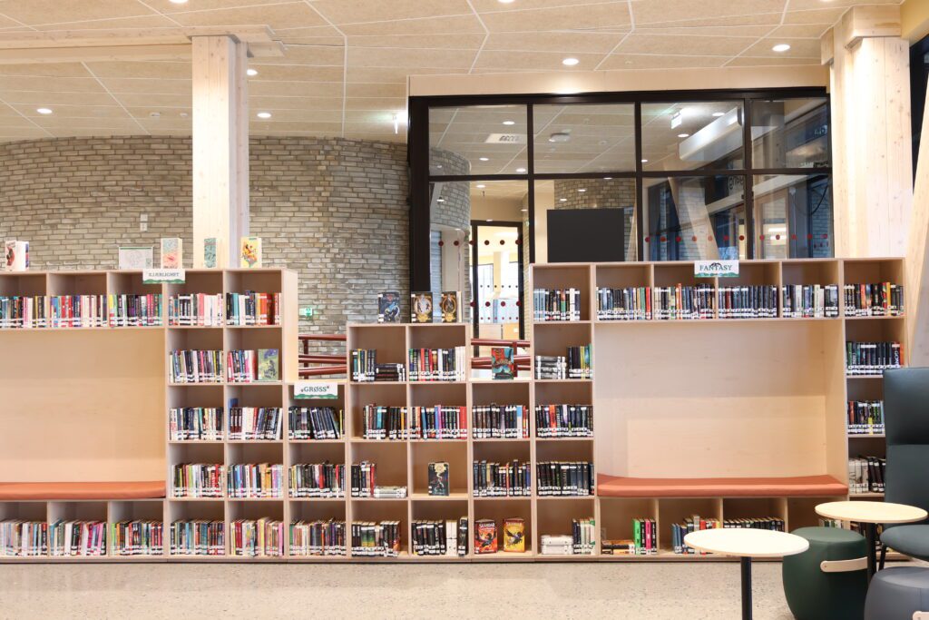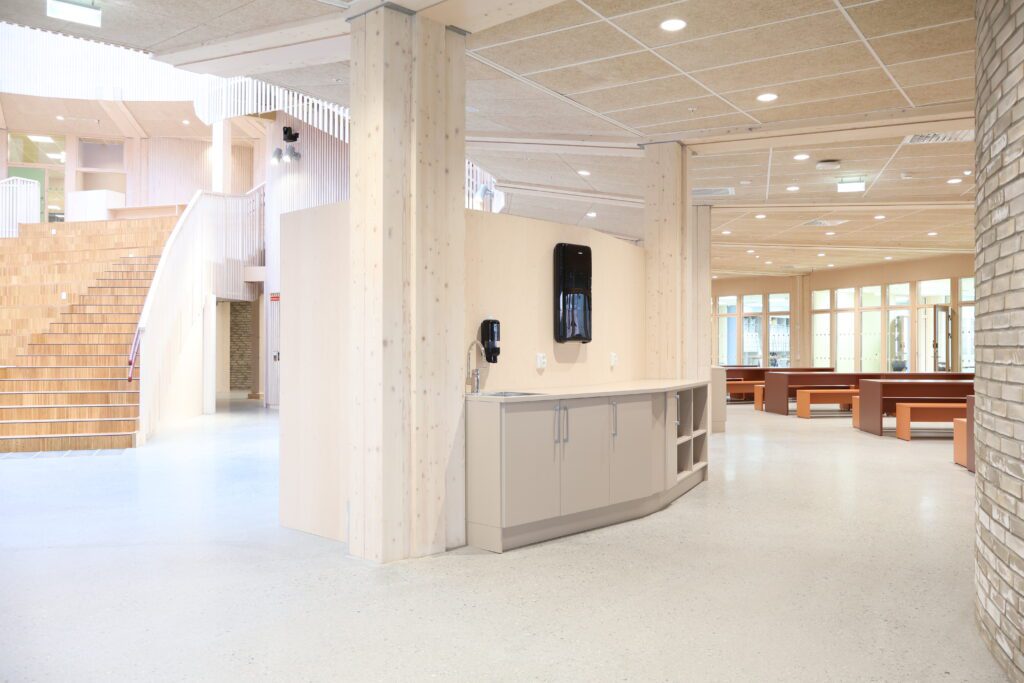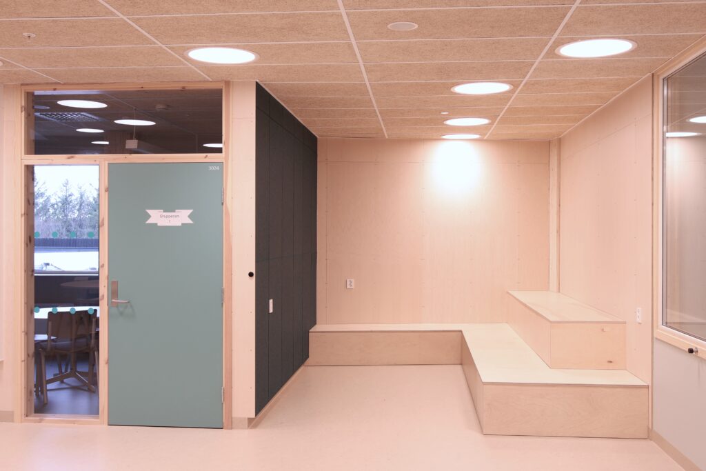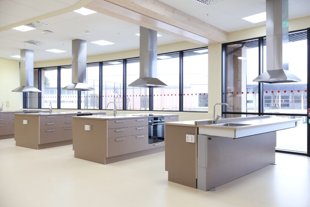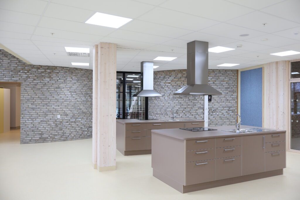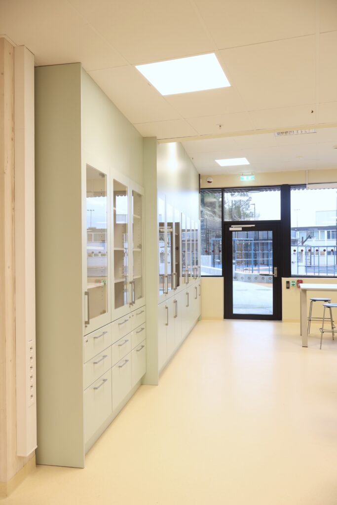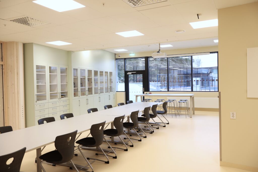 Vår leveranse omfatter blant annet fagrom som skolekjøkken, naturfagrom, skaperrom, multifunksjonsrom, sløyd og kjøkken til forsterket avdeling. I tillegg har vi levert hjemmeområder med bokskap, integrerte sittenisjer og skrivebord, elevgarderober, miljøstasjoner, bibliotekinnredning og en rekke stedbygde sittenisjer, både frittstående og innfelt i vegg.