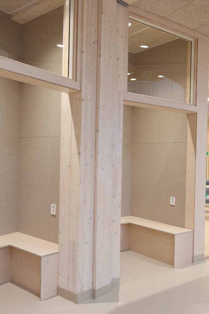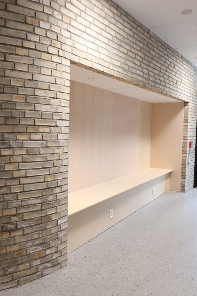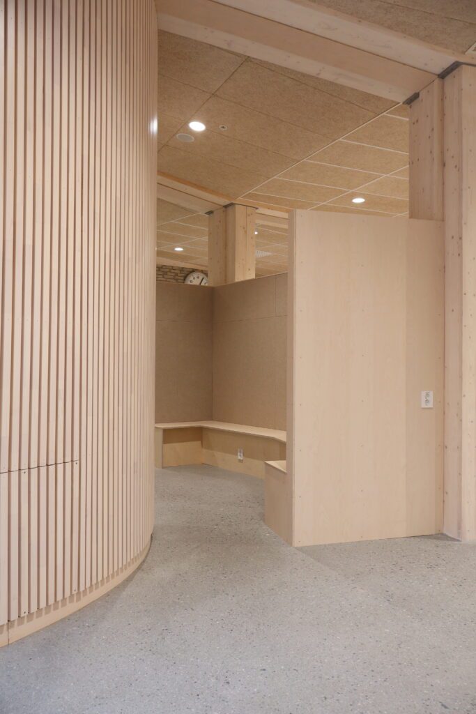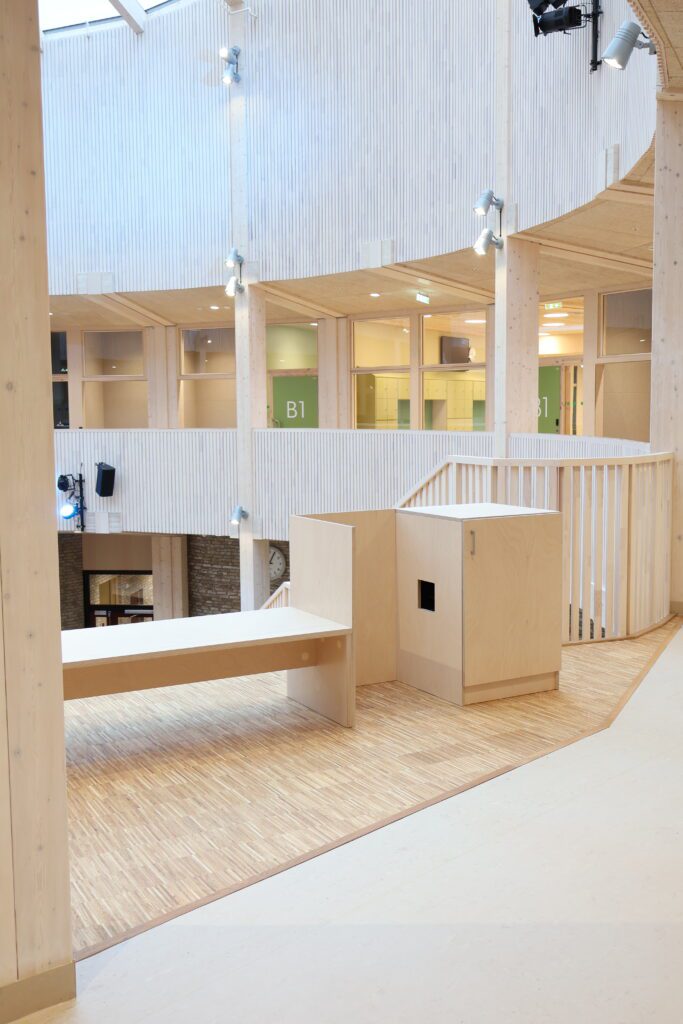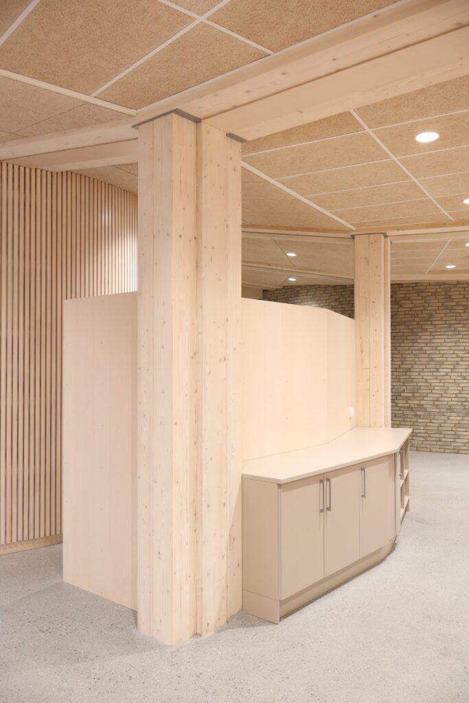 Dette var tydelig definert som en del av prosjektets konsept. Løsningene er basert på arkitektens prosjekterte underlag, og videreutviklet i tett dialog med både totalentreprenør og byggherre. Vår rolle har vært å bidra med erfaring og praktisk forståelse, særlig knyttet til utforming av stedbygde møbler, samt å sikre gode avklaringer mot øvrige fag og en ryddig gjennomføring på byggeplass.