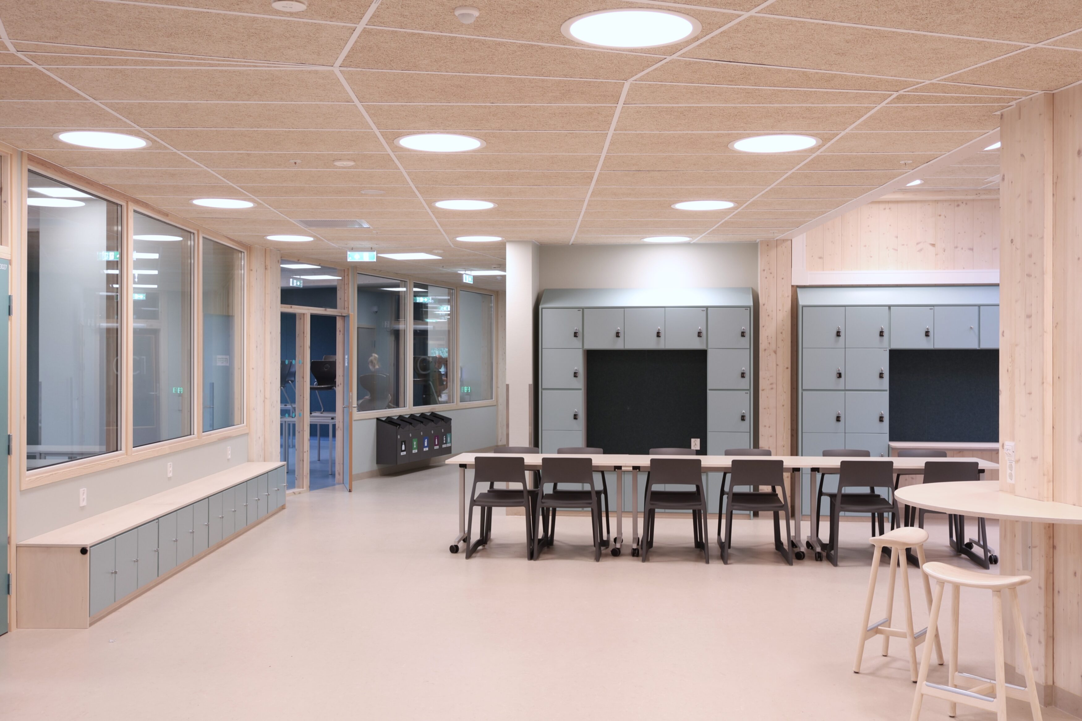 Noe av det mest spesielle med Frakkagjerd ungdomsskole er byggets sirkelform. Dette gir flotte romopplevelser, men stiller samtidig ekstra høye krav til fast inventar. Her finnes det få standardmål, og hvert møbel har måttet tilpasses rommets faktiske geometri.