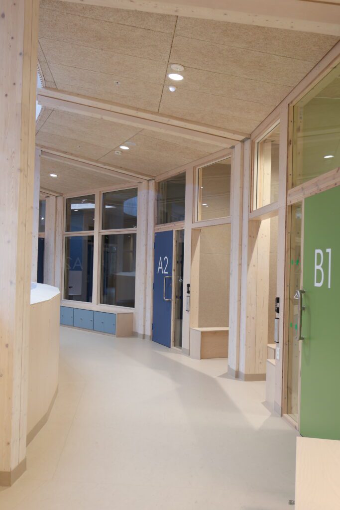 Bygget preges av naturlige materialer som heltre, glass, tegl og betong. Store mengder tre gir en lun og trygg atmosfære, og bidrar positivt til læringsmiljøet. Den gjennomarbeidede fargepaletten, med rolige grønn- og blåtoner, gir de ulike sonene egen identitet samtidig som helheten oppleves harmonisk og oversiktlig. Fast inventar er utført med tydelig fokus på holdbarhet, vedlikehold og levetid – viktige faktorer i offentlige bygg.
