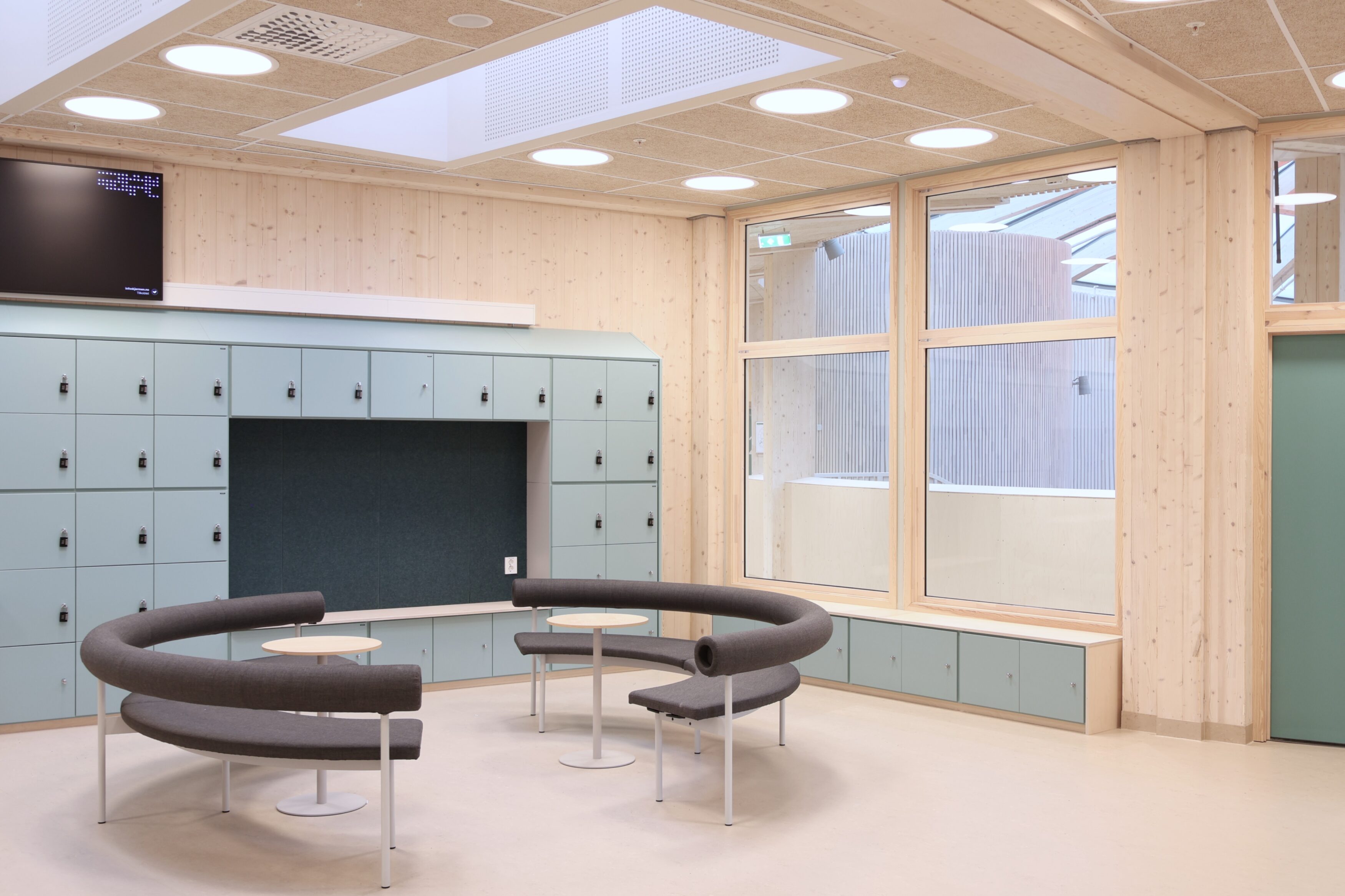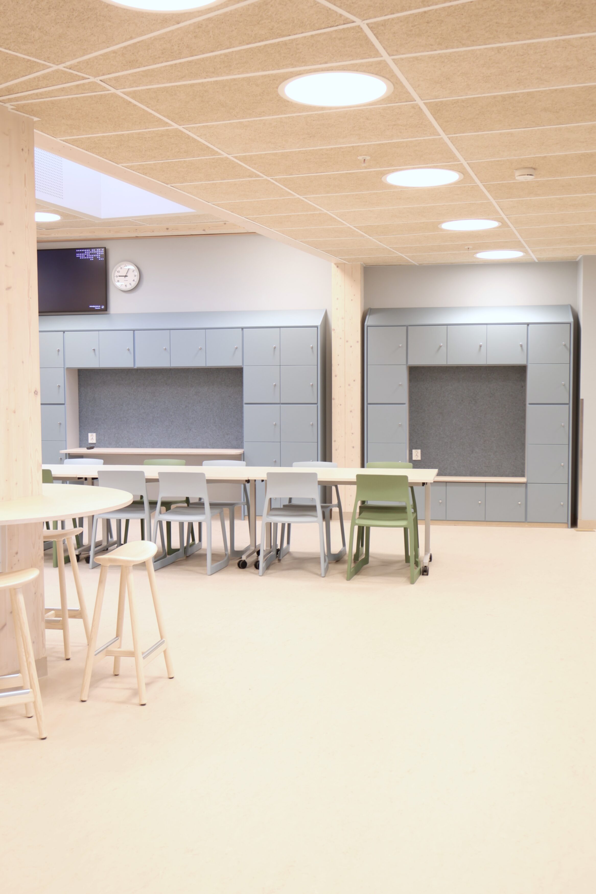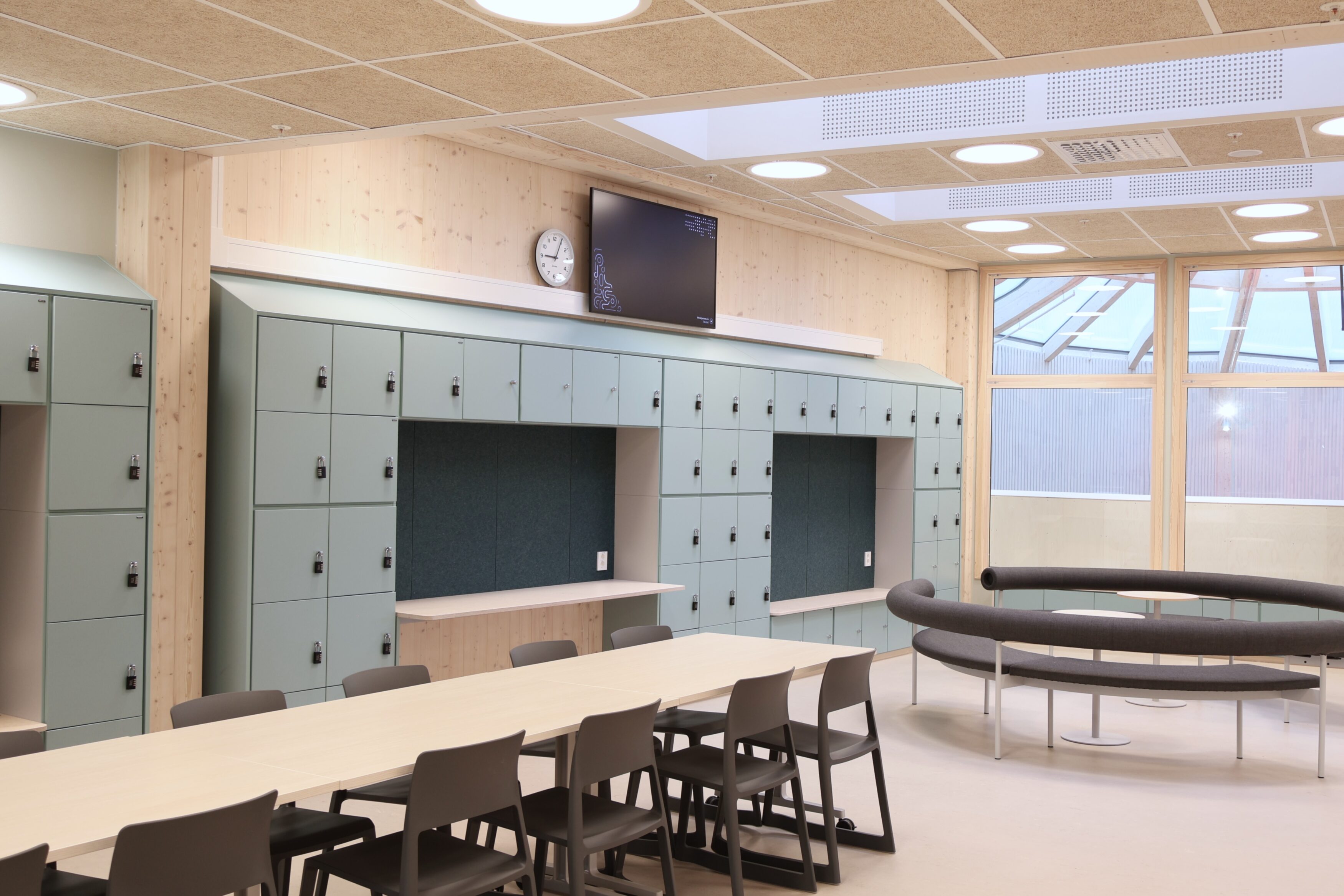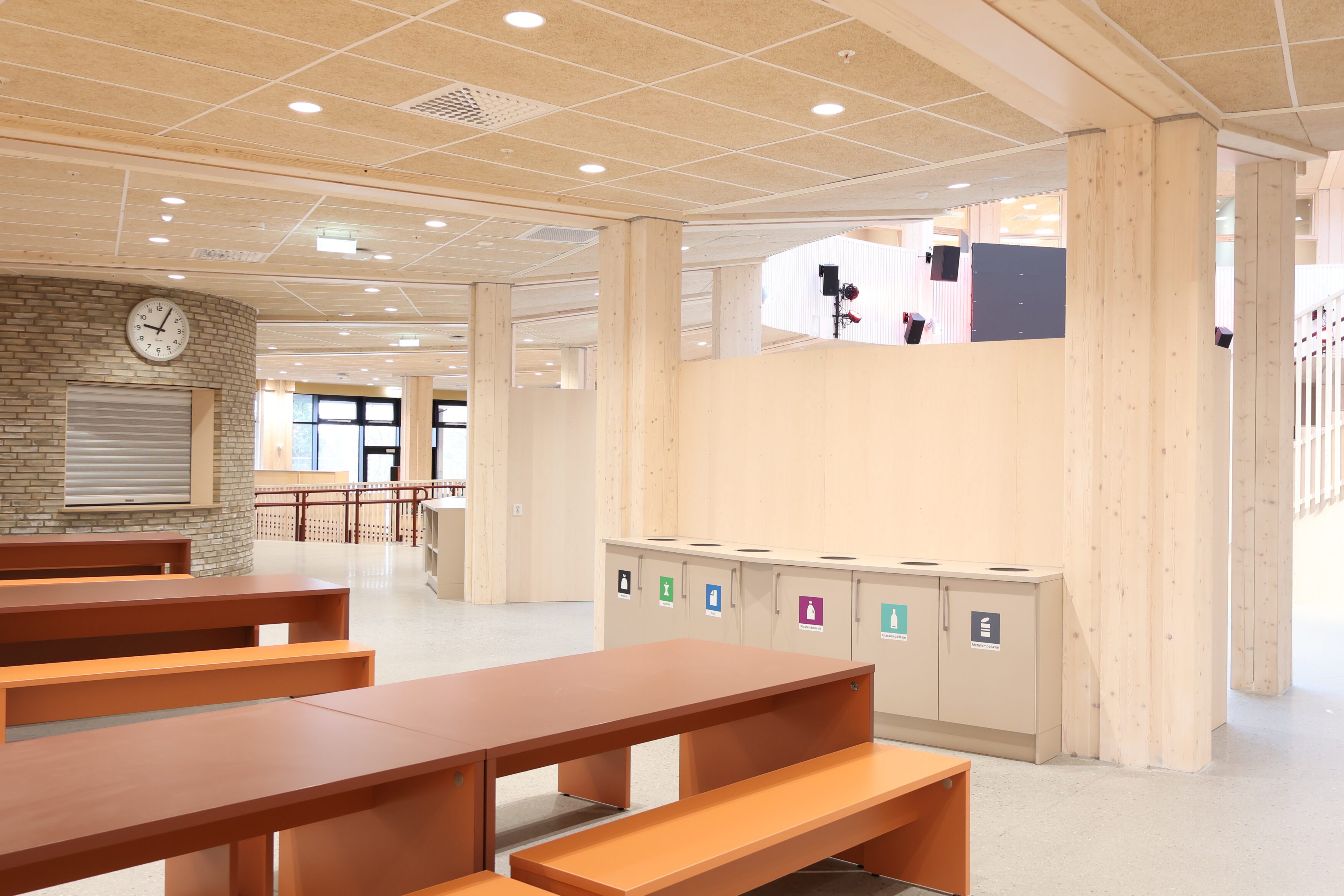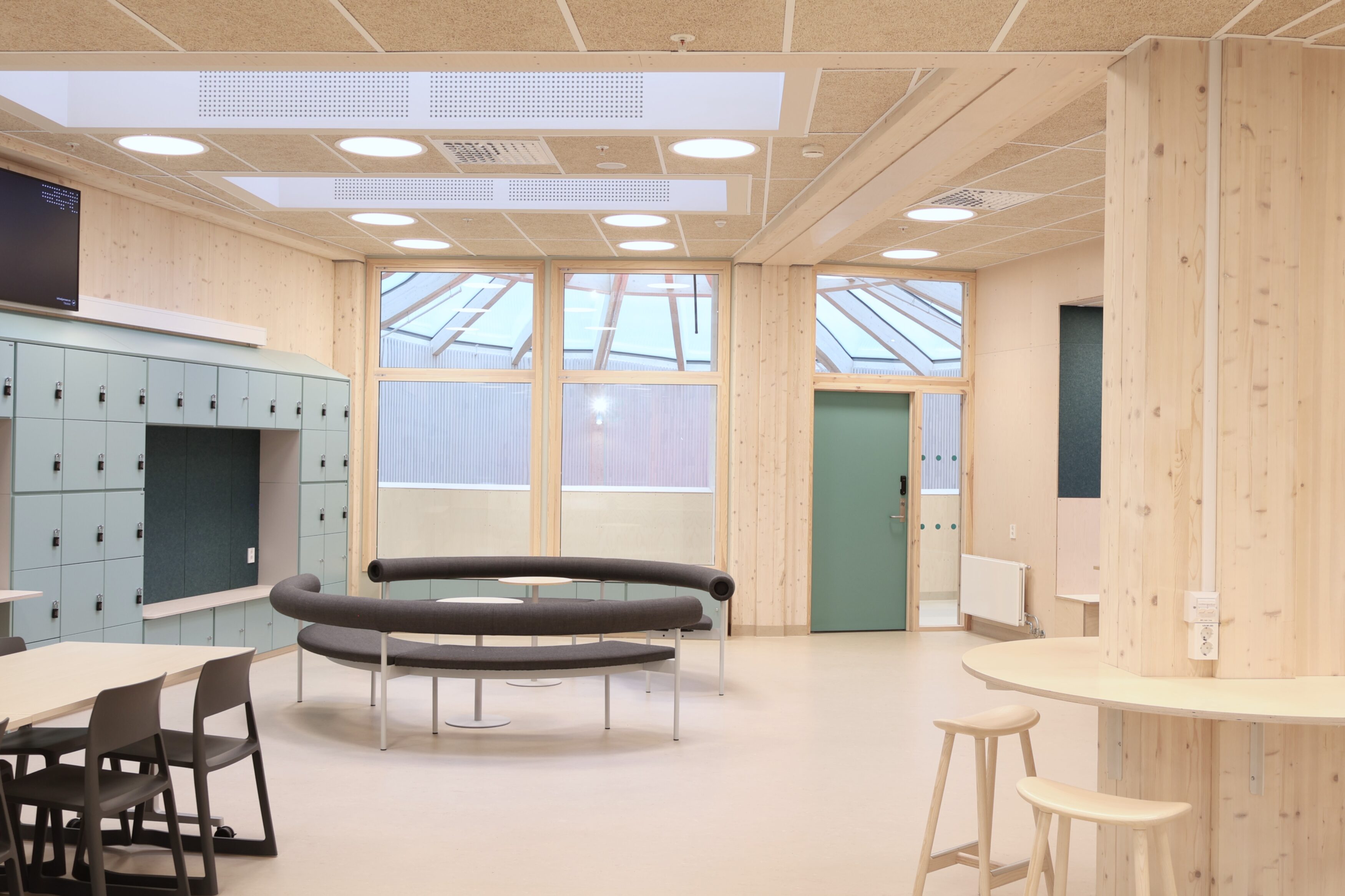 Noe av det mest spesielle med Frakkagjerd ungdomsskole er byggets sirkelform. Dette gir flotte romopplevelser, men stiller samtidig ekstra høye krav til fast inventar. Her finnes det få standardmål, og hvert møbel har måttet tilpasses rommets faktiske geometri.
