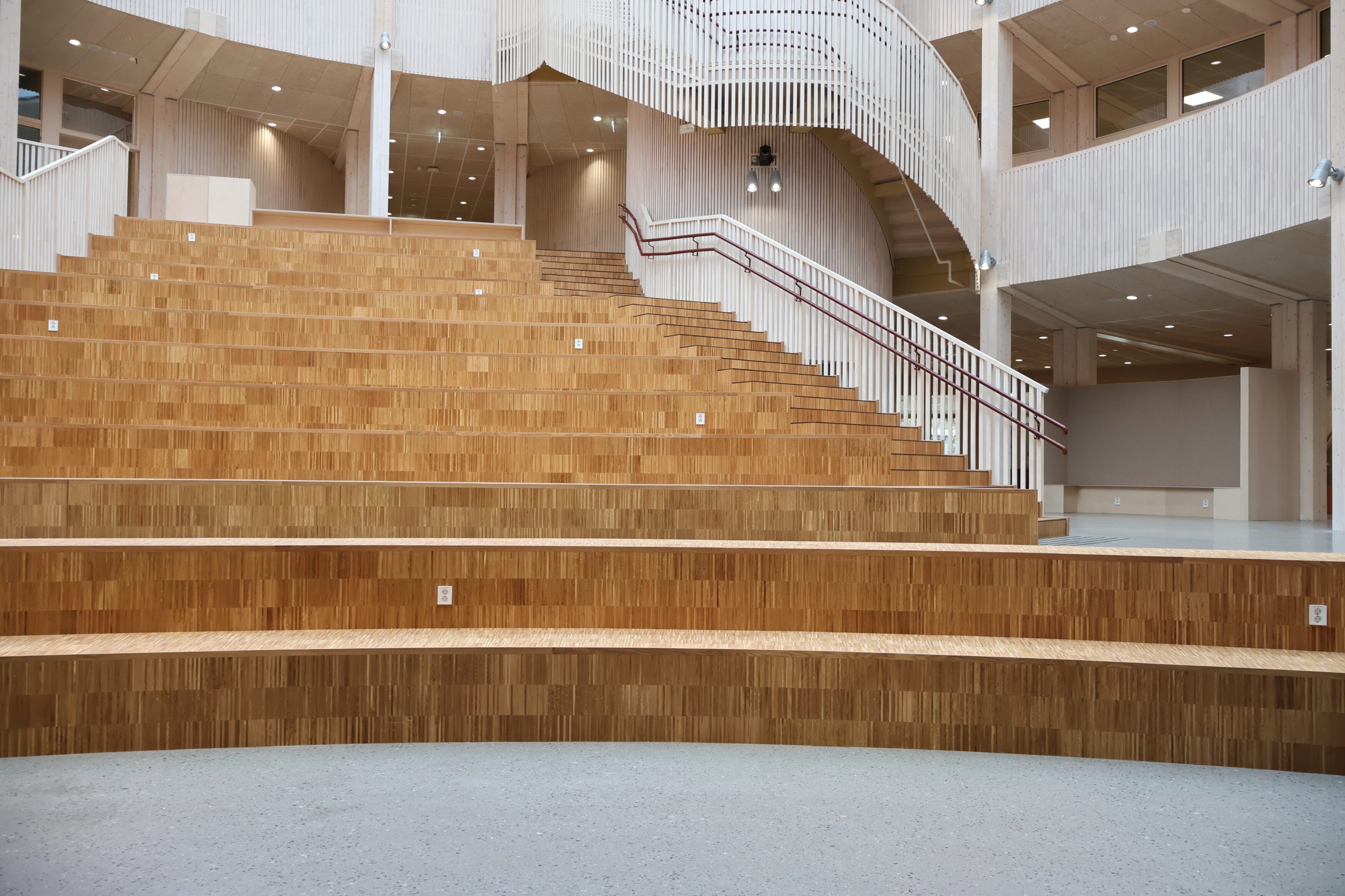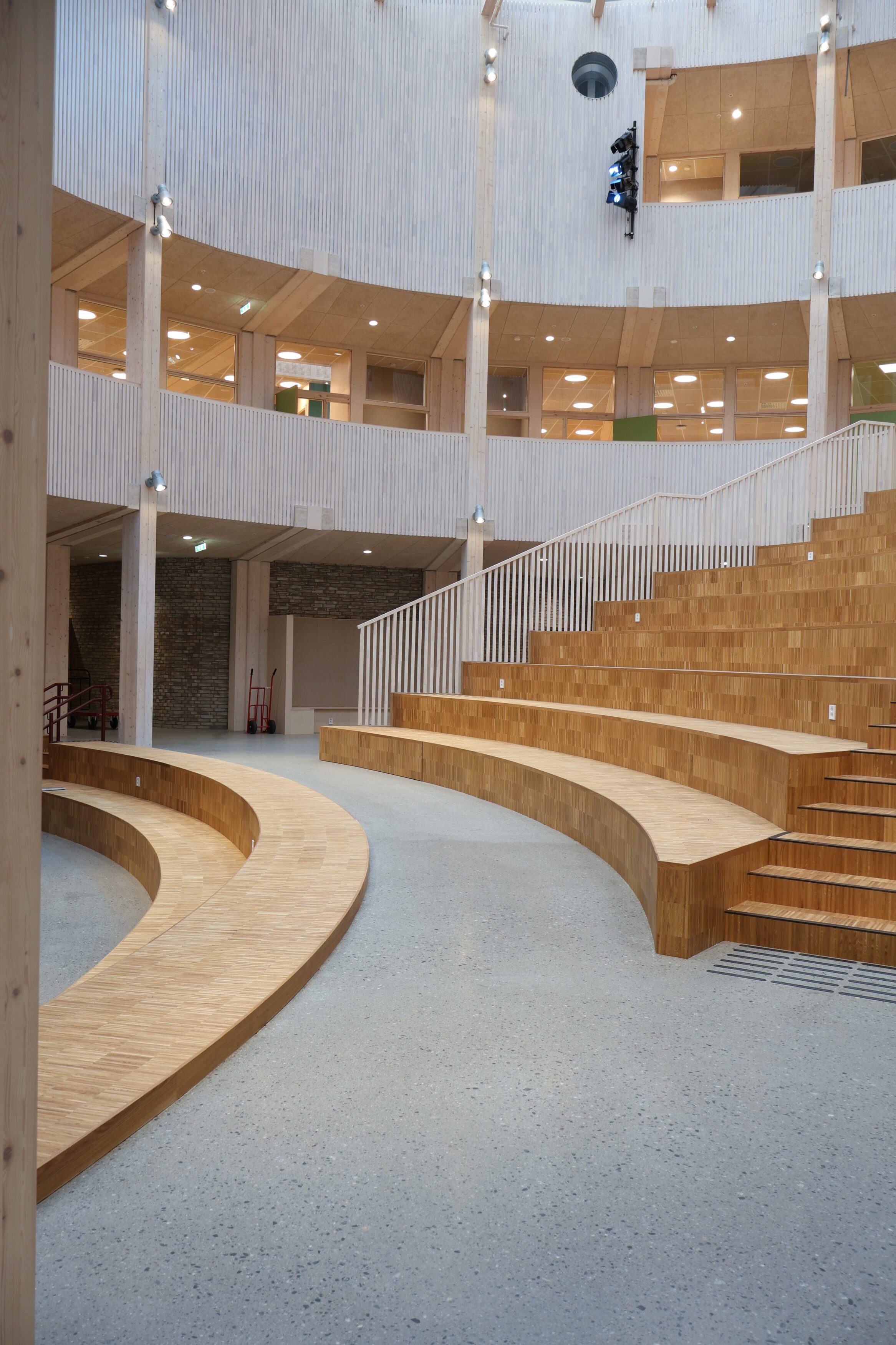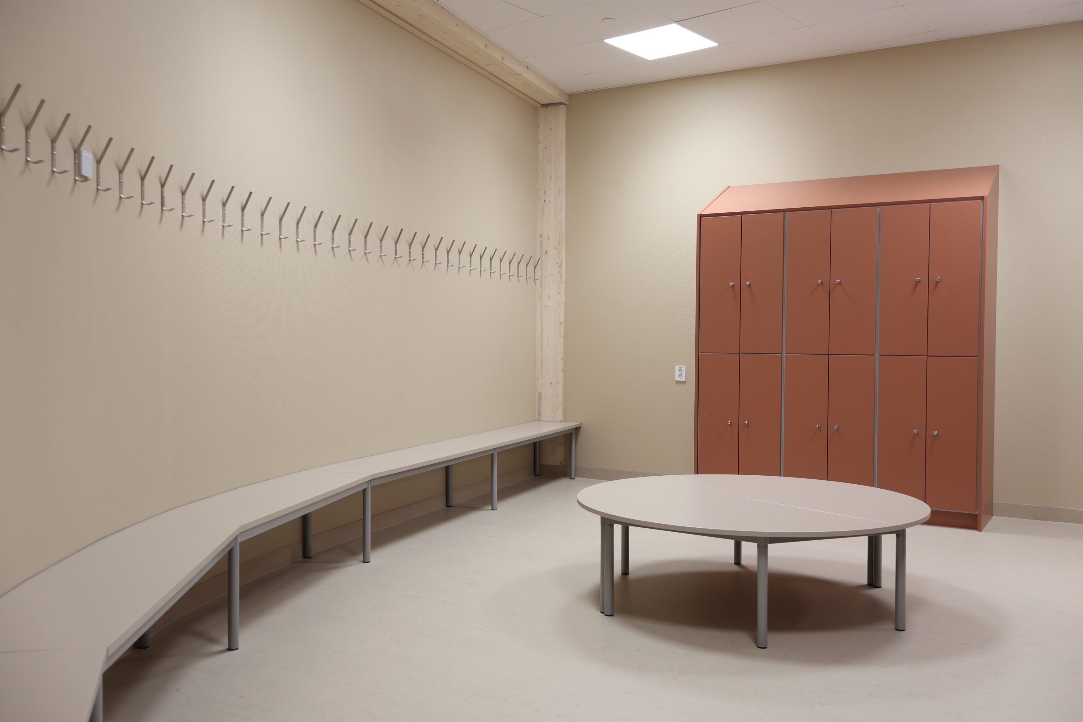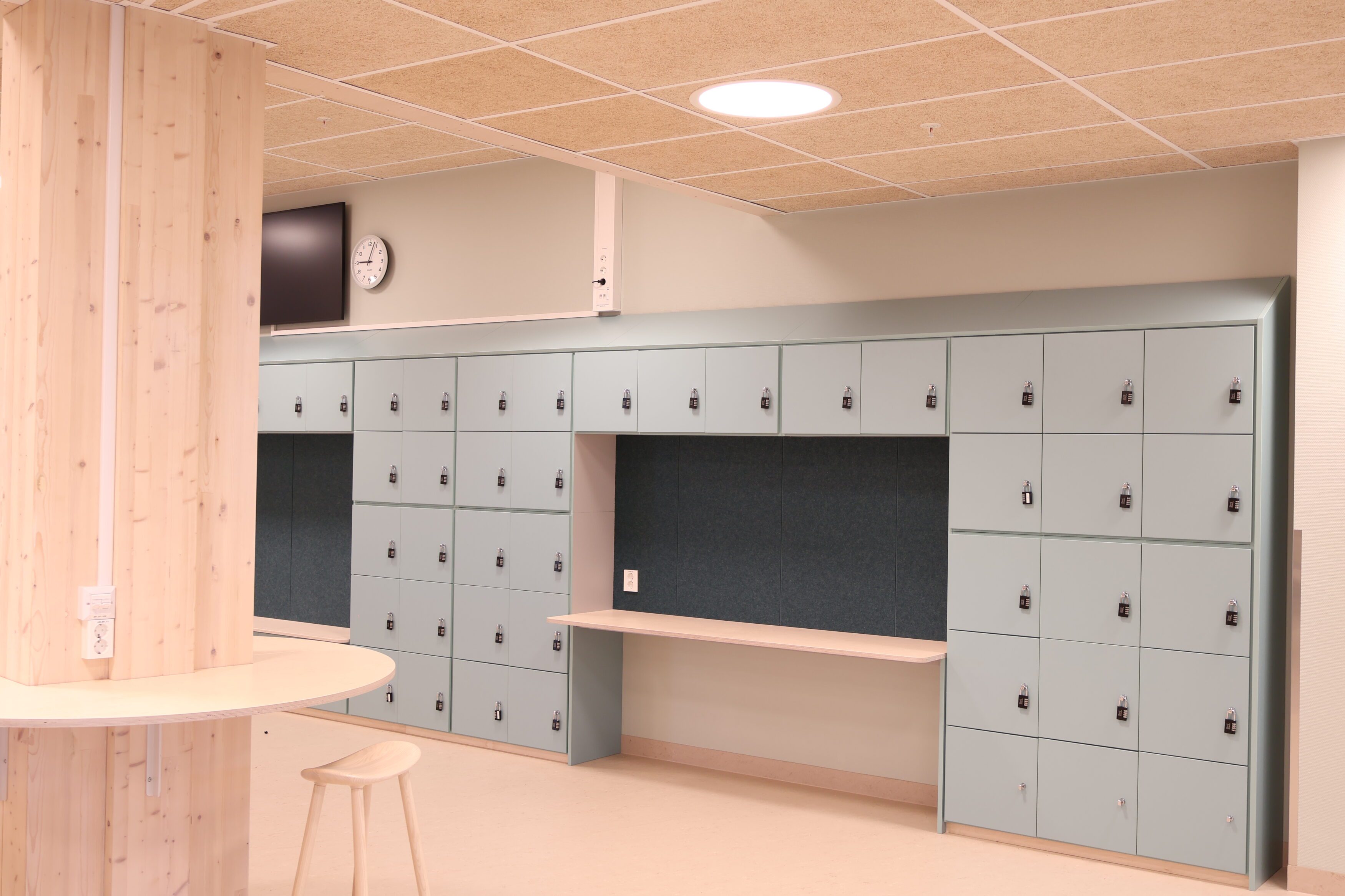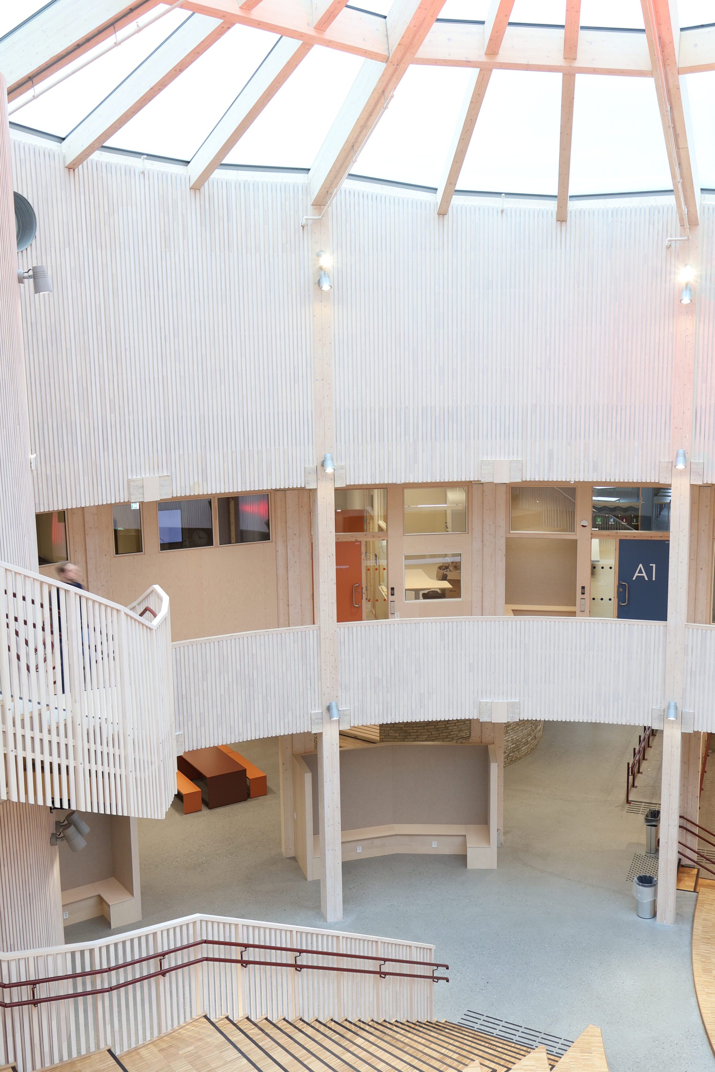 Noe av det mest spesielle med Frakkagjerd ungdomsskole er byggets sirkelform. Dette gir flotte romopplevelser, men stiller samtidig ekstra høye krav til fast inventar. Her finnes det få standardmål, og hvert møbel har måttet tilpasses rommets faktiske geometri.