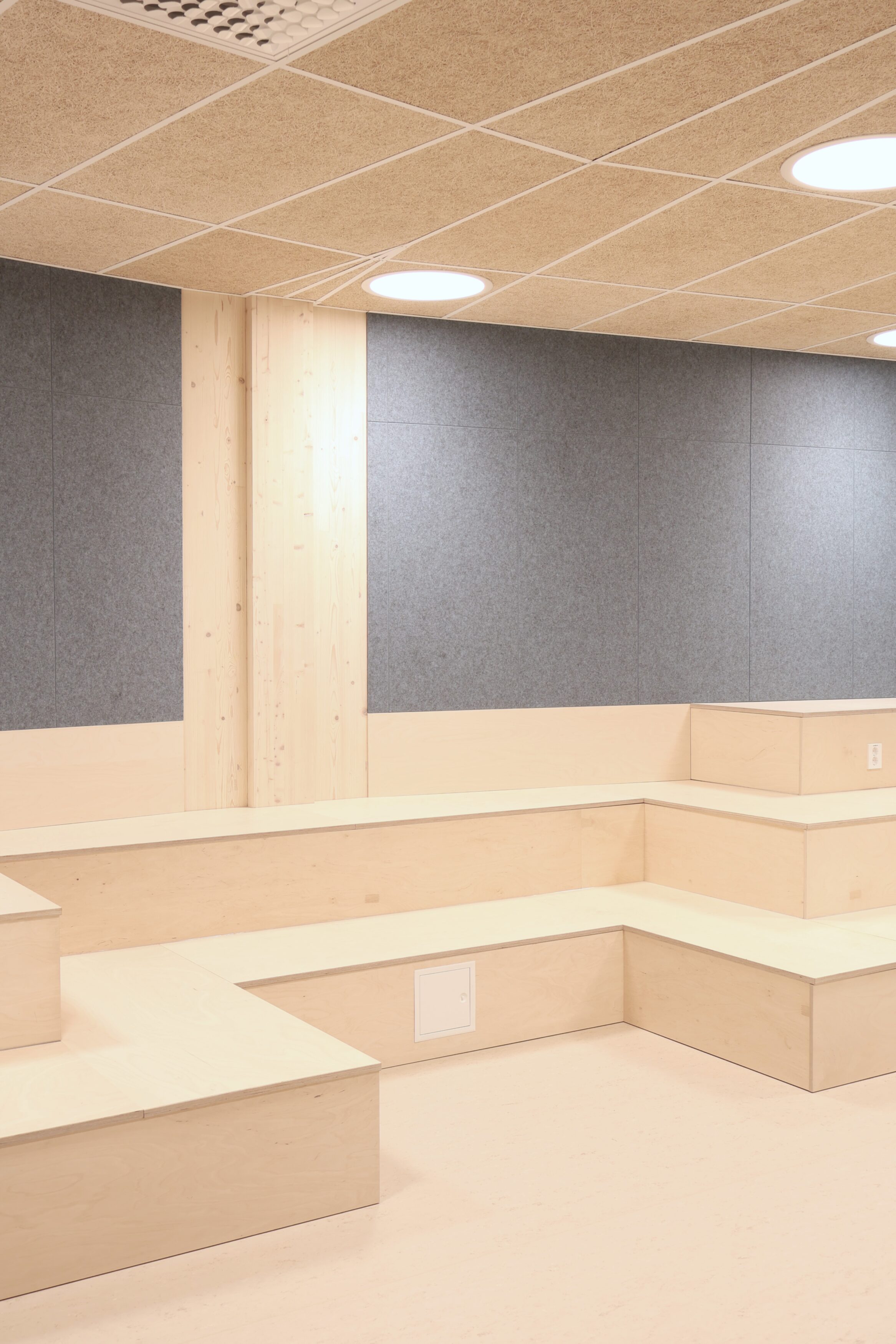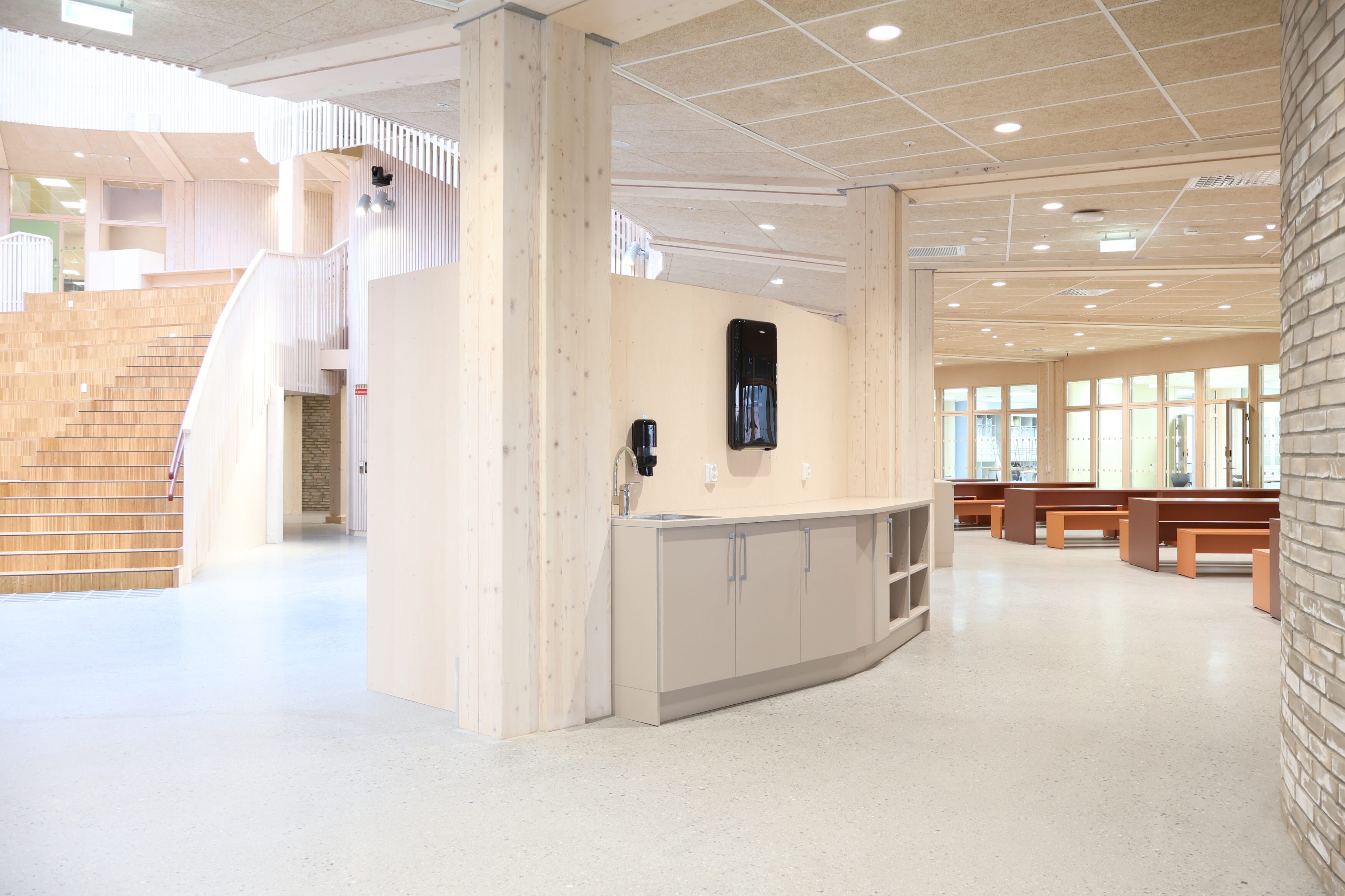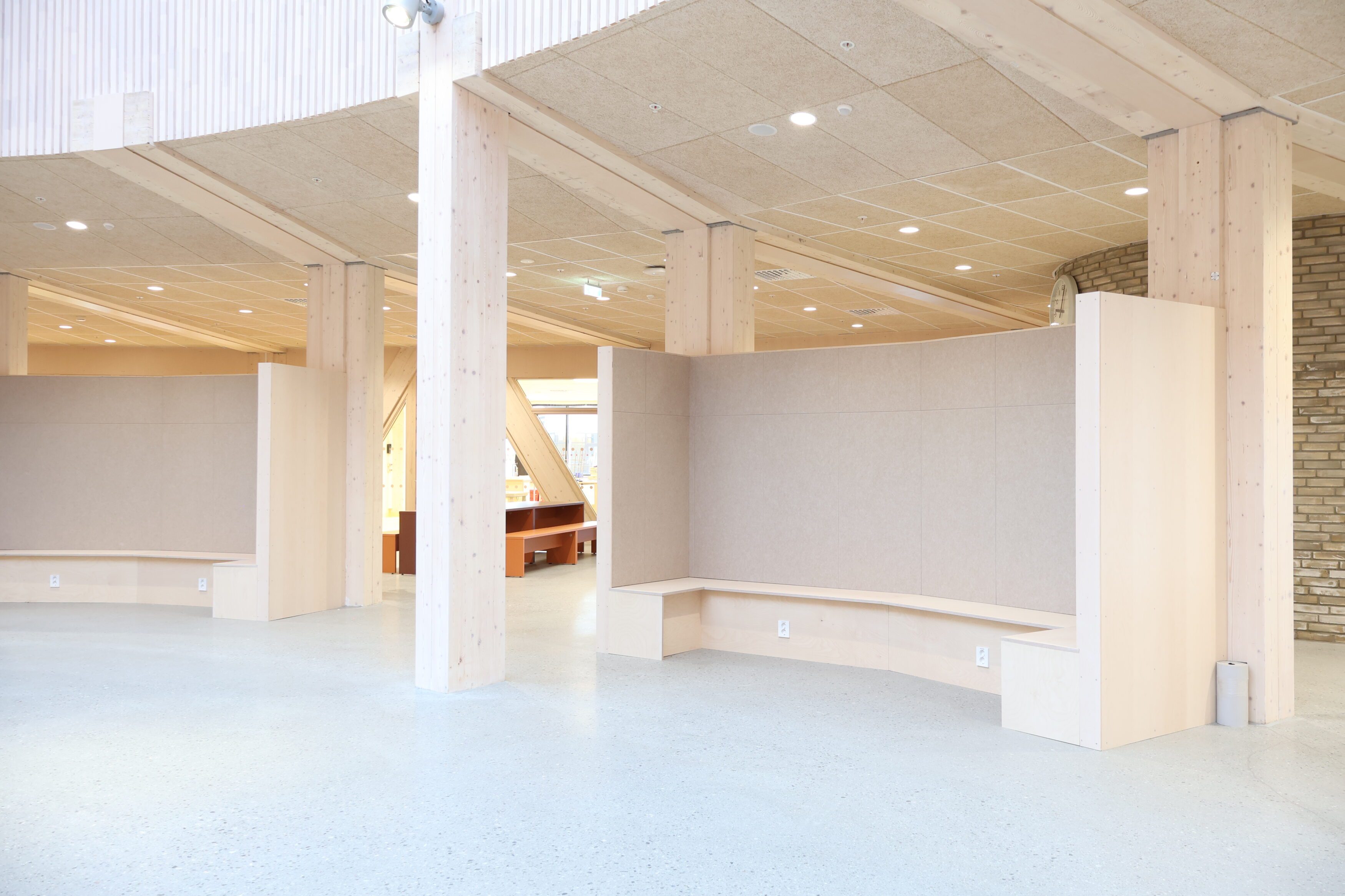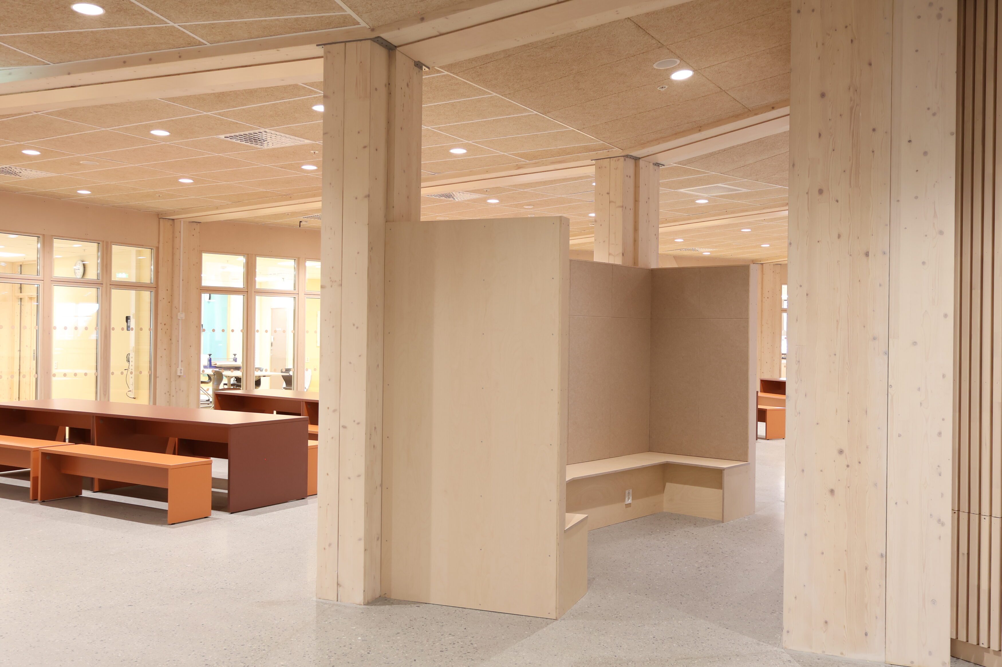 Dette var tydelig definert som en del av prosjektets konsept. Løsningene er basert på arkitektens prosjekterte underlag, og videreutviklet i tett dialog med både totalentreprenør og byggherre. Vår rolle har vært å bidra med erfaring og praktisk forståelse, særlig knyttet til utforming av stedbygde møbler, samt å sikre gode avklaringer mot øvrige fag og en ryddig gjennomføring på byggeplass.