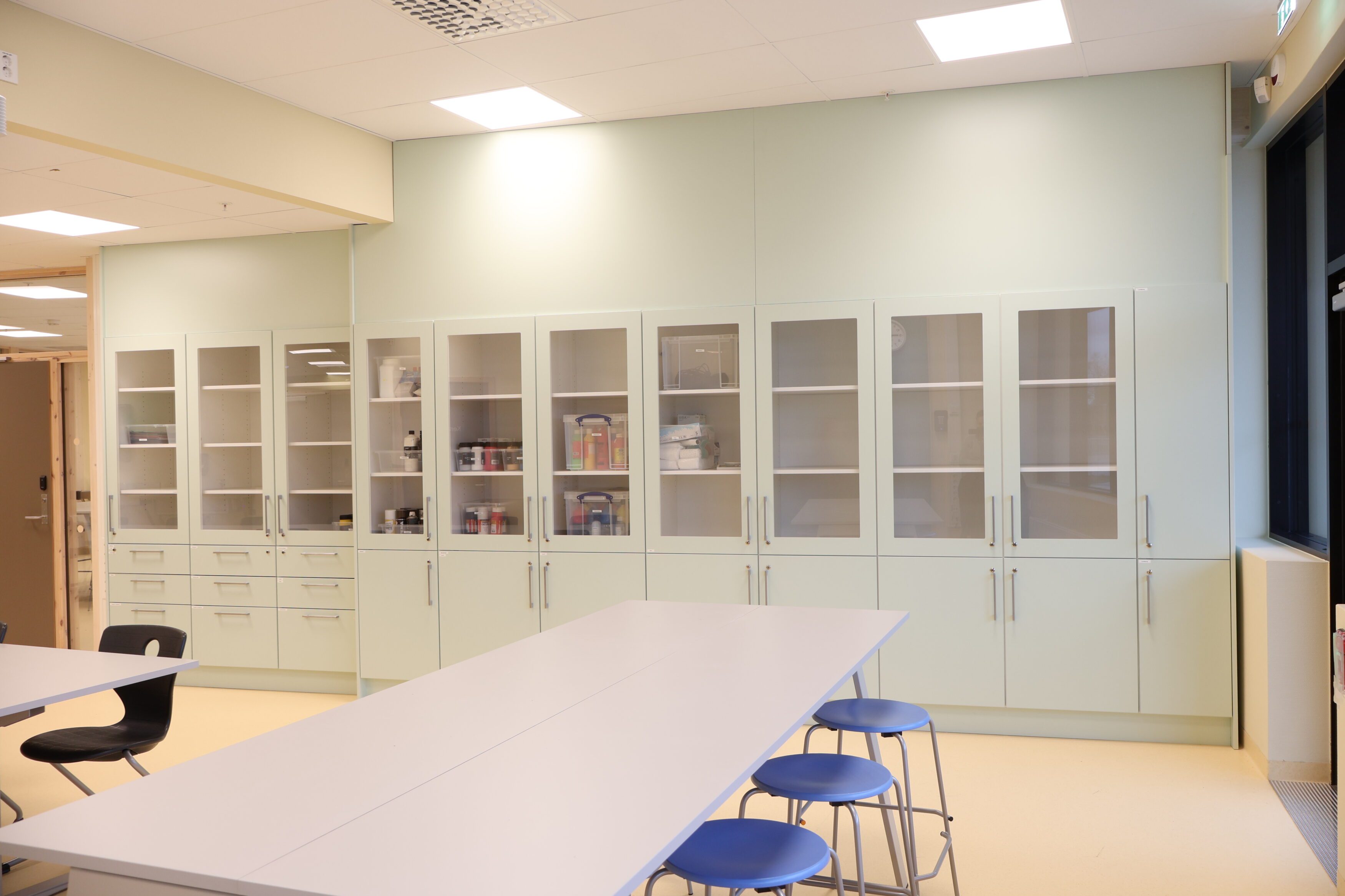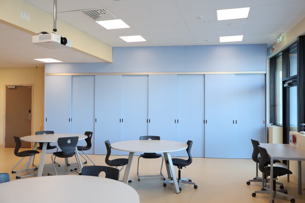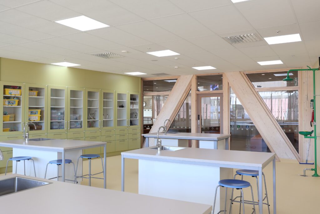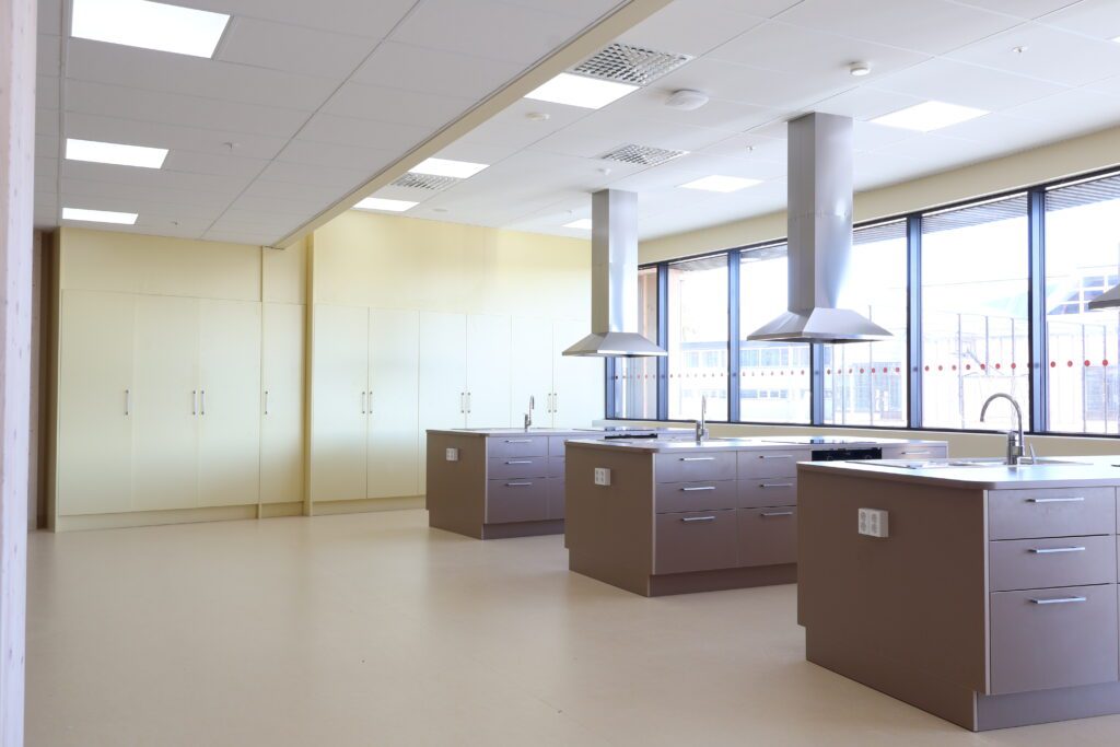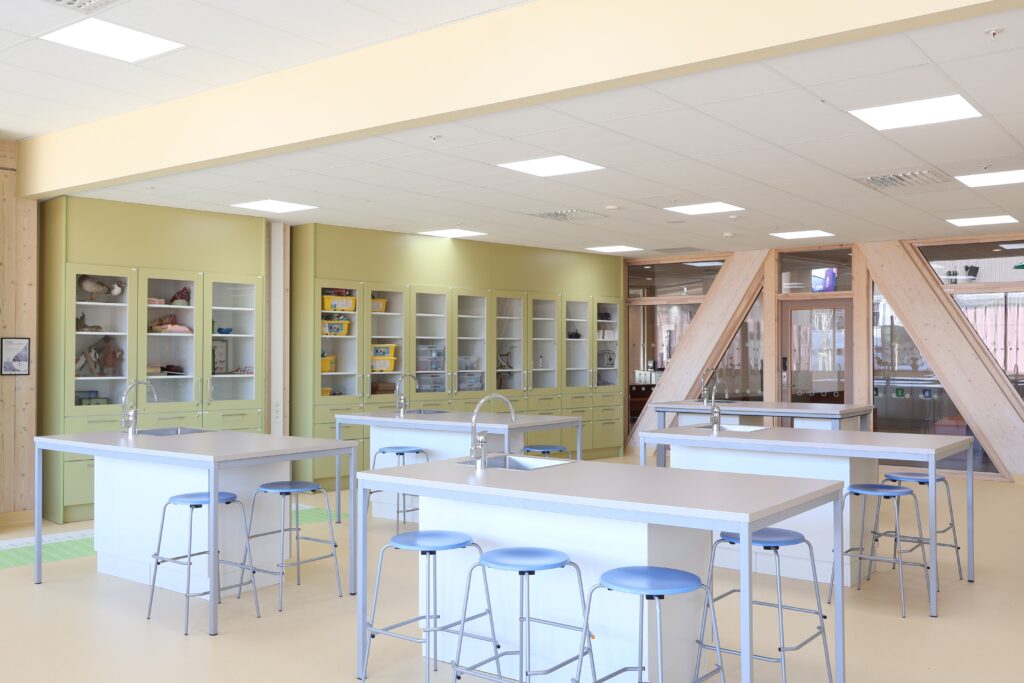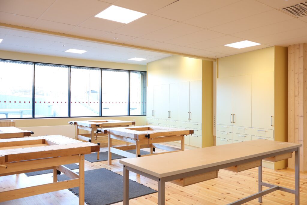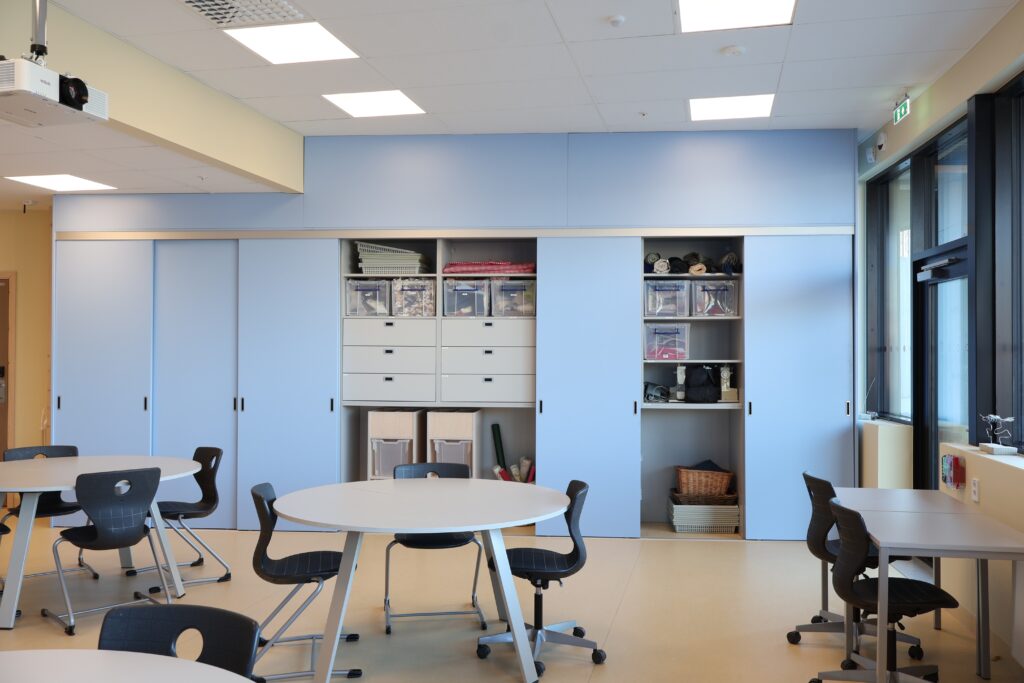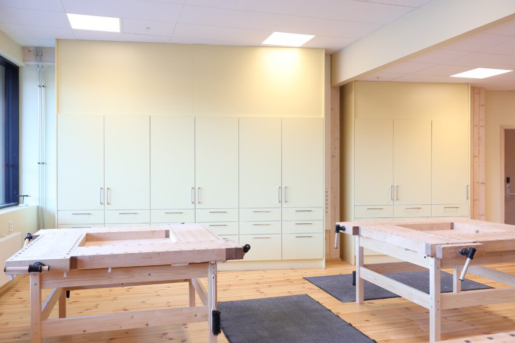Vår leveranse omfatter blant annet fagrom som skolekjøkken, naturfagrom, skaperrom, multifunksjonsrom, sløyd og kjøkken til forsterket avdeling. I tillegg har vi levert hjemmeområder med bokskap, integrerte sittenisjer og skrivebord, elevgarderober, miljøstasjoner, bibliotekinnredning og en rekke stedbygde sittenisjer, både frittstående og innfelt i vegg.