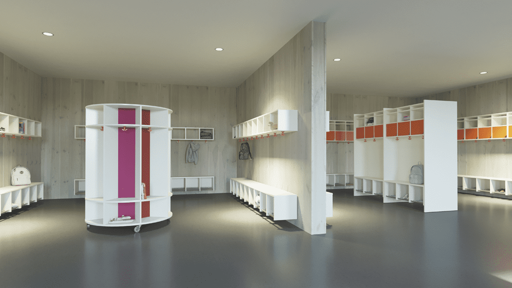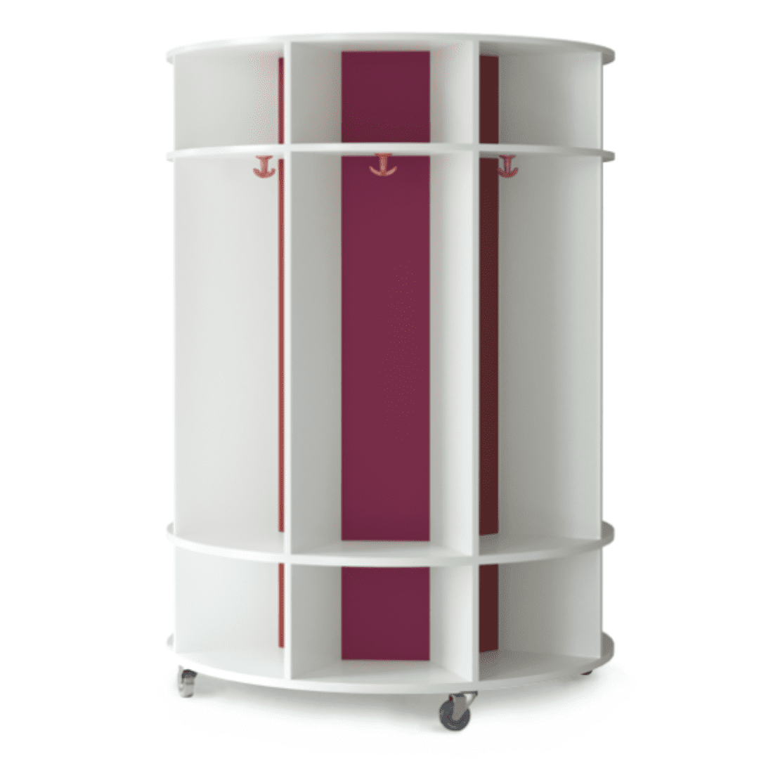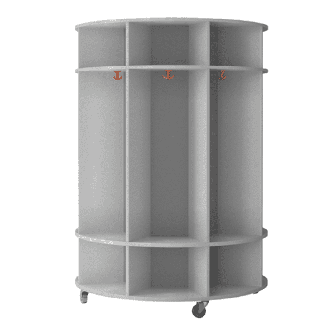 Rund garderobe i lys grå direktelaminat, eller semistandard høytrykkslaminat, med hjul. Leveres med Hlín sikkerhetskroker eller tradisjonelle ankerkroker i stål. Hlín sikkerhetskrok i grå eller orange. NB: oppgi farge på kroker ved bestilling.