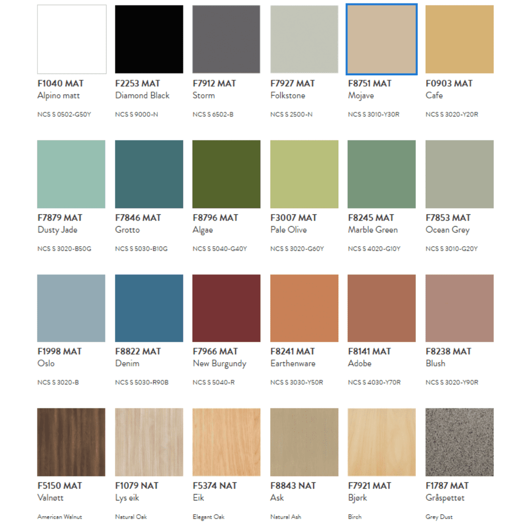 • Dører: Hvit, lys grå, mørk grå eller eik. Eller semistandard.